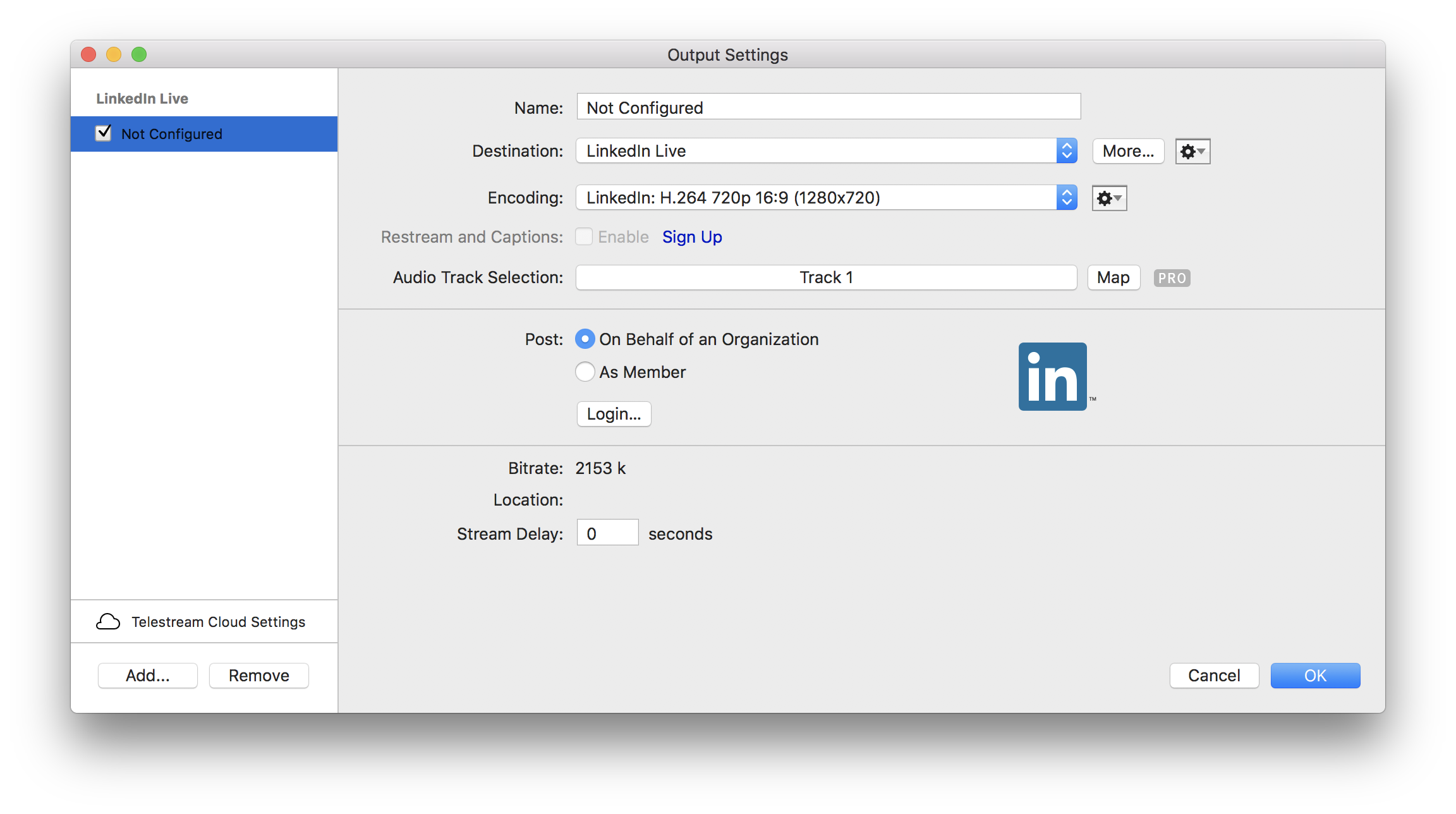 Latest release of Telestream Wirecast 12.1 has the destination although to actually use it you have to get approval from Linkedin as it's still in beta on their end.