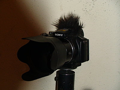 I convert my 1440 X 1080p videos from the HX1 on the free Prism Converter into Xvid, using the higher-level quantizer target rate of 3.0 (default is 4.0) and get a 16 Mbps result. I edit this into 1920 X 1080p with MP4 on AVS Video Editor 4 ($60. U.S. for their entire package of A/V programs), using a 16 Mbps rate. The results can be used where 1920 X 1080 is required for fullscreen display, such as Vimeo and the quality looks good to me. The Sony PMB program provides a very good still-capture feature and acceptable HD vid-caps can be extracted from its video, in low light where photos can't be taken. One fault, compared to a camcorder, is the non-variable zoom speed, although it becomes slower for video than with still photos. It needs a small fake-fur windscreen, to block the very bad wind noise on its poorly-placed mike openings. I made one from the fur of a small stuffed poodle and attached it with shoe goo. It eliminates about 90% of the wind problem. If you wanted to pay $1,200. or more for a last-year's Sony XR500/XR520 AVCHD camcorder, you might get comparable performance in dim light and probably a little better in good daylight. The new XR550 has reduced lens power. I'd enjoy your HX1 while it lasts. You can still buy a new one for $400. at a few places, but they won't be available much longer. It seems uncertain if a new HX1 upgrade will be offered, but nothing has been heard about one. Here's a couple of pictures, showing the windscreen and the steadying rod I sometimes use. It's attached with a 1/4-inch bolt embedded in the wood core of the metal tube and fastened with a wingnut and a large fender washer to spread out the load on the bottom of the camera.