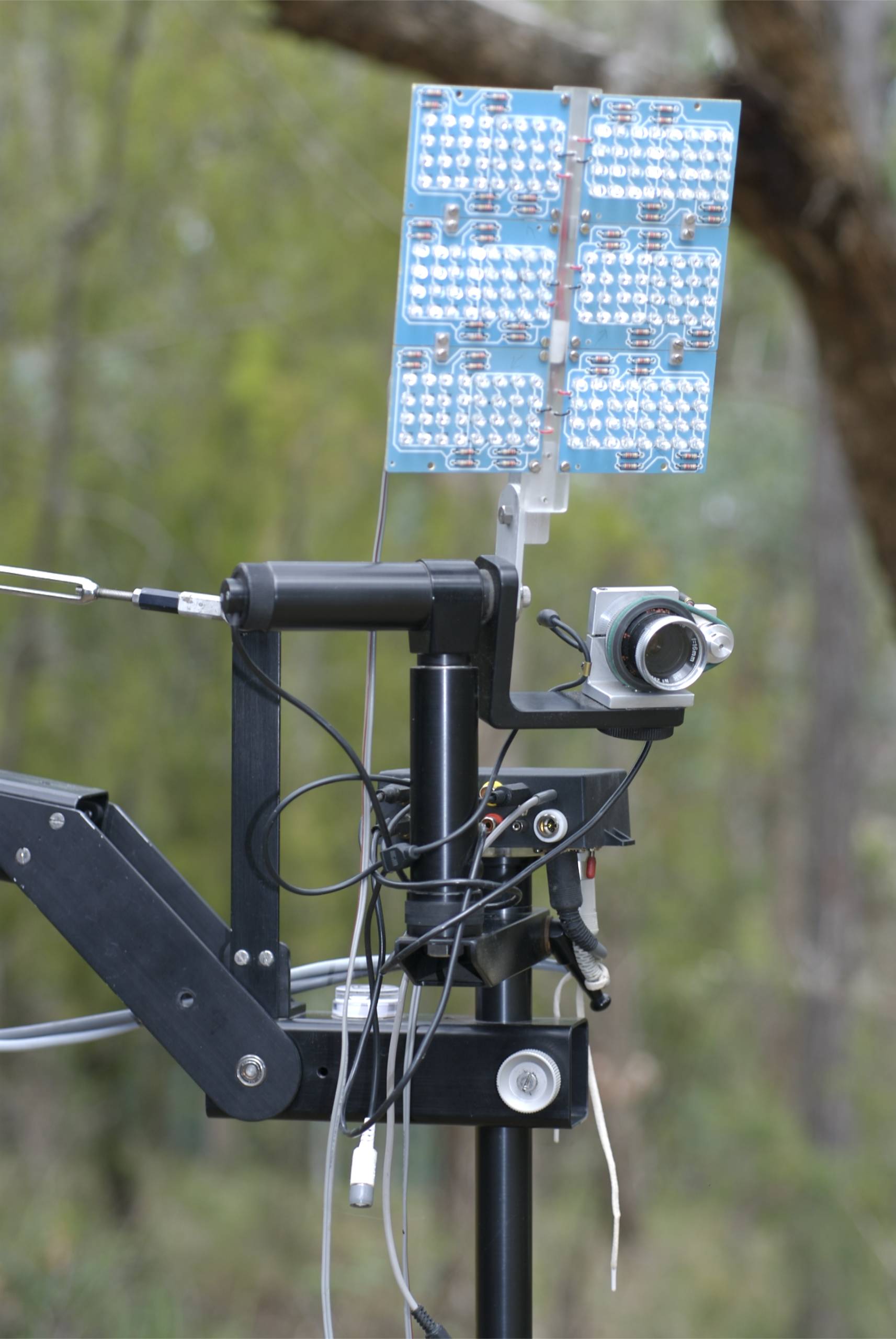 The problem is that there must really be a lot of IR light if the camera should not start gaining. Most IR Lamps state a distance they can light up. This is a specification that is difficult to use because you cannot know how much gain there is needed to film in the specified distance from the IR Lamp. Flood lights only have light enough to film a few meters away without the need of gain - specially with a HD camera - remember every pixel is only about a quarter of the size than in a SD kamera. I needed to light up a large area so I was shure to have light where the owl would land. I did not dare to put the stands and lights to close - if it would frighten the birds. |