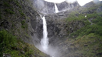 Spend 6 days out in the field and I think I have enough footage to get some in for this round. One of the highlights of the tour was a trip to one of the ten highest waterfalls in Europe, the Mardalsfossen (Mardal Waterfall). This is one of the most powerful waterfall I ever witnessed. Manage to get all the way up to the pouring, rainy and wet environment where the water hits the ground after a vertical drop of 360 meters! The total fall is more than 700 meters high. This time of year the tiered waterfall is floating free, throwing 45 cubic meter of water per second out from the mountain peak. Of course doing any serious recording in this kind of environment is very difficult, but I got some exciting footage after all. Below you see a screen capture of how the waterfall is like at some distance. Even at this distance the front lens glass was covered with vapor in seconds