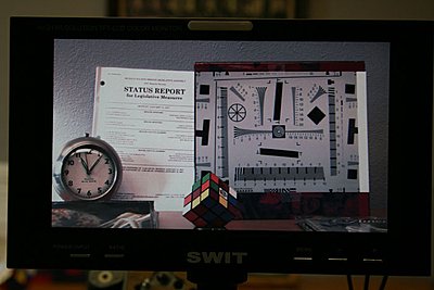 The HD (800x600) monitor described above hooked up to my A1 and pointed at some stuff. I printed some resolution chart I grabbed off the internet, it was like 3,000 x 2000 pixels and printed it on photo paper . Added a few other things. Now, the weakness in this test is that I am not a very good still photographer and this was just set up quickly in my office. Sorry, but that's the story. Now, the shots I snapped look a tad softer than the monitor looked with my own eyes. Take it for what it's worth. I like the monitor. I can see hair and pores on someones face when I Zoom in a bit, so it works for framing and focus. Colors seem reasonably close. Oh, the A1 was set to factory and zoomed in to 40 and the aperature was somewhere in the 4.0 range. 30F 1/60 fps.