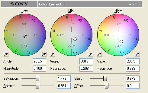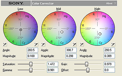 With the color corrector, I did the "quickie" white balance first. I clicked on the High "complementary color" eye dropper and picked something white. I then clicked on the Low "complementary color" eye dropper and picked something black. Finally I did the same for "Mid" with something grey. However, I then needed to manually adjust them further to make it look as good as the color fixer plus version. Then gain, gamma, and saturation were adjusted (causing me to need more color wheel adjustments).