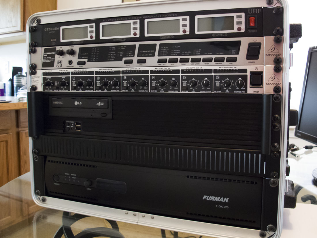 The final major component that goes into the rack case arrived today, the Furman F1000 power conditioner and battery backup unit. I am still waiting on various patch cables and connectors so I can hook everything up and get it working, but I now have all the major components. Starting at the bottom of the rack is the power conditioner and battery backup unit. This provides power for the whole system. It allows me to plug into AC power sources that provide irregular and unreliable power. Even under poor power conditions, it will still output constant clean AC power to all of the other components. It also features a battery backup, so if I should loose power for any reason everything won't just shut down. Moving up the case is the PC. The PC serves three primary purposes in this setup- First the video switcher is controlled via PC software. It is possible to purchase a dedicated hardware control panel for the switcher, but that is an additional $5,000. The PC also works as a graphics machine, allowing you to edit video graphics and photoshop and load them into the video switcher's graphics channels via USB. Finally the PC also acts as the video recorder, allowing several hours of high def recording from the main program out of the video switcher. Above the PC is the audio mixer. This is a basic 6 input line level audio mixer, so there isn't too much to say about it. Four of the inputs will be tied to the wireless audio receiver. The other two inputs will remain free for patching into a house audio system or adding additional hard wired audio sources- Such as from a video playback system where pre-recorded video elements or instant replays are necessary. Next is a pro level analog to digital audio converter. The main output from the audio mixer will be connected to this converter. It will then output a digital AES/EBU audio signal. The video switcher only accepts AES/EBU audio, so this component is necessary to tie the audio in with the video. In addition to converting the analog audio to digital, this converter provides some other useful features. The detailed VU meters will make it much easier for the audio operator to monitor levels. It also features a built in world clock sync generator which can be used for genlocking the video switcher and cameras. This will prevent audio sync drift in extremely long recordings. Finally at the top of the rack is the wireless audio receiver. This receiver will work with four individual microphones all simultaneously. The four display screens on it will let the audio operator monitor the status of the different microphones, including how much battery they have left and signal strength. Moving around to the back of the unit it is obvious that I haven't done any of the cabling yet. At the bottom of the case from the back you can see the video switcher itself. This is where all the cameras and video sources get connect. It allows me to cut, dissolve, or wipe between the various sources. It supports live graphics keying on two internal media channels. It also has a built in high quality chroma keyer. The video switcher also has a broadcast grade hardware H.264 encoder built in. This means I can connect the encoder to the PC via ordinary USB and save the output. Since the video switcher is doing all the video encoding, the PC's processor is hardly used at all in this process. I should have all the various cables and connectors I need to start hooking everything up next week. Once I have everything up and running I will post another update. |