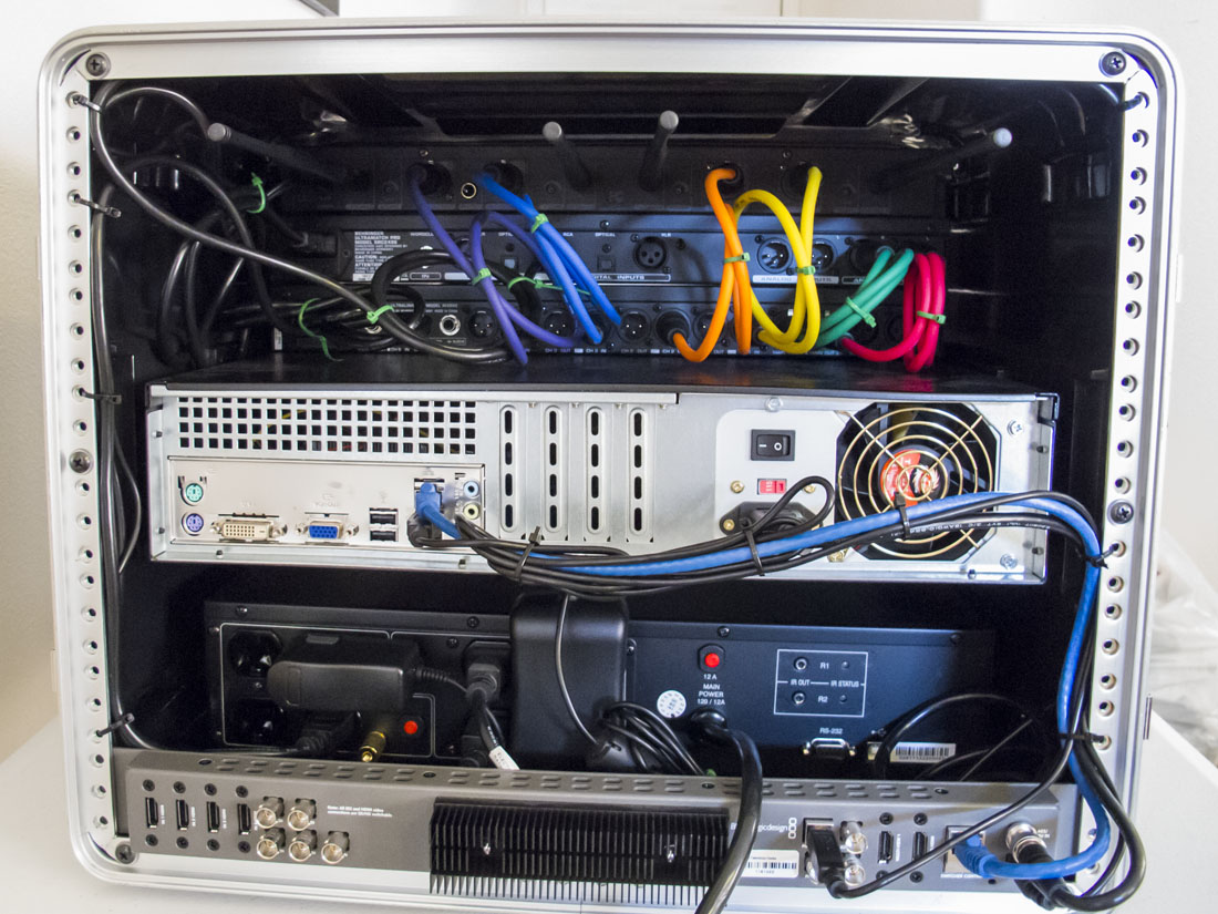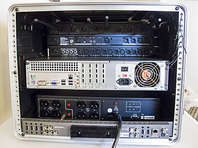 It is done! I finally have everything put together and working. All the various cables and connectors, everything. Now all I have to do is finish my website and get some clients :-) Attached is a picture of the finished flypack showing how it will likely be set up when I am actually using it on gigs. The table is a portable folding table, there are two monitors plus the keyboard and mouse that will all need to be plugged in. This is all run off of the power conditioner with only a single power cord for everything. The cameras will all plugin to the back of the flypack. I can run four wireless mics off of the flypack itself, but I also have two free 1/4" audio inputs for patching in external sources. |