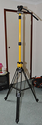 I actually build quite a lot of rigs and also do tutorials for them as well. It's fun to wander around the aisles at the hardware store and think "Wow..I could use that with my camera! " Always been a bit of a DIY freak and if I cannot find what I want I figure I can make it. Cost of the extension was a cool $00.00 !!! I had the stand in my studio doing nothing really and it was getting in the way. It originally was the stand for two 500W halogen lights that I used for video a long while ago!! The rig actually works better than expected and I can drop the tripod down so all the legs are closed and the height drops to around 4' something... extend the tripod legs just with the first double tubes out and extend just one yellow tube section and it's close to about 6'6" ... extend the 2nd tube and it touches the ceiling ...if needed I could also extend the second set of tripod legs but that would have to be outside and my little single step ladder would be too low so I won't use that one. What I really need now is a stand with around 40mm tubes that I can rip to pieces but I need it in aluminium!!! Chris |
