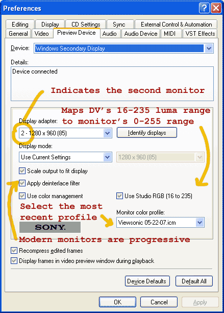 If you convert from Y'CbCr (always 16-235 range for legal values; for 8-bit) to computer RGB (0-255 range for legal values), then Y' = 235 maps to 255 255 255 RGB. (assume neutral chroma in all examples) Y' = 236 to Y' = 255 all get clipped to 255 255 255 RGB. If you convert from Y'CbCr to studio RGB (16-235), then Y' = 235 maps to 235 235 235 RGB. Y' = 236 maps to 236 236 236 RGB. Y' = 254 maps to 254 254 254 RGB. So studio RGB handles values above whites (AKA superwhites) and also values below black. Though there are some Y'CbCr values which will get clipped. 2- The scopes can be setup in different ways. It's confusing. 3- Vegas will display the studio RGB values directly in the video preview window, so the image will look off. The best thing to do is to monitor on a broadcast monitor (mostly for various other reasons). Quote: