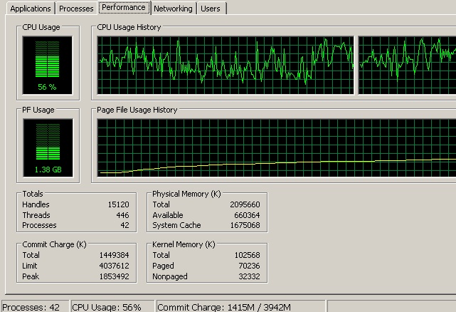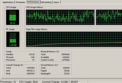 I'm worried about this. Is my page file usage out of control? It caps out around 1.4gigs. Also I thought maybe my thread count should be lower...I have Vegas's thread usage set to 4, Dynamic preview ram at 1 gig (highest it can go) This is what I see after about 5 minutes of rendering. Doesn't matter what kind of original file it is or what type of codec/file type I render with, I end up with an approximate 2 frames per second render speed at this point. The renders all start off really fast but then slow right down. It doesn't matter what kind of effects I have, I can be doing something bare-bone. My system stats are 2.6 GHz Pentium Dual core, 4 gigs (seriously) of RAM, plenty of hard drive space, decent pci-ex video card. Any suggestions? I could really use the help :( |