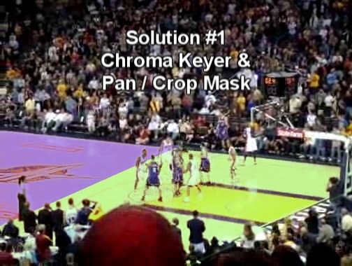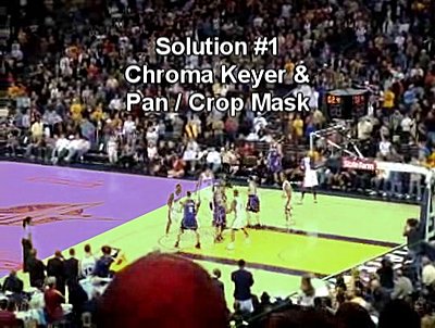 For both solutions, apply a pan / crop mask to your video track. Then keyframe that mask for all the movements in the video track. Yes this will take forever. Sorry! Then once all the mask keyframe movements are set, copy the event properties (Ctrl-C) and use the paste special command to paste the event attributes on to a blue generated media just below it. Then add a cookie cutter FX to the blue media and choose the cutout shape. Now key frame the cutout's movements on the blue track. Now copy those attributes from the blue to a new green generated media and change the cutout from "cut away all but section" to "cut away section" Adjust the opacity of the event or tracks for the two generated media to taste. The advantage of method #1 is that you get a very simple pan / crop mask, since most of the work is done by the chroma keyer. The downside to method #1 is that your "color overlays" are only as good as your ability to chroma-key. If player uniform colors match the floor, then your players may dissappear into the chroma key, makign it hard to spot players. Method #2 will take a bit more time, since you might need to adjust your key in order to avoid throwing the "color overlay" over the crowd. Both methods will be considerably assisted by a camera that is completely stationary. For a stationary camera, I would choose method #2. |
