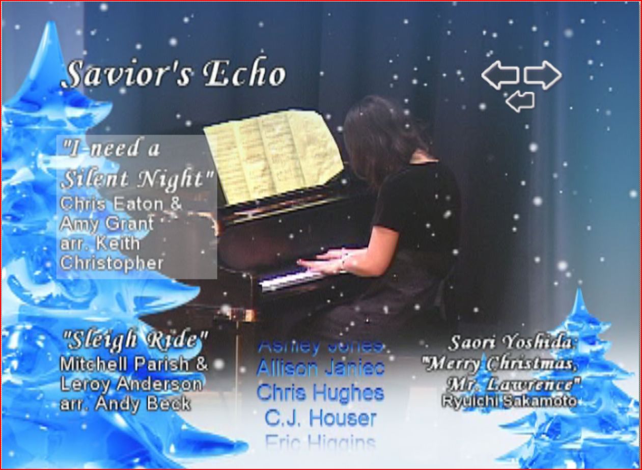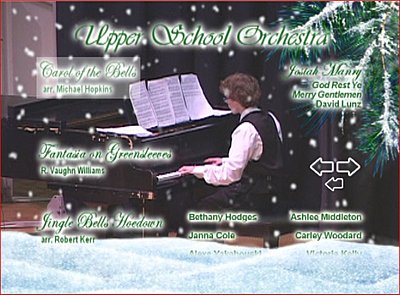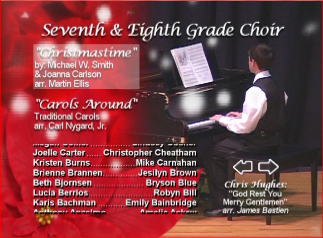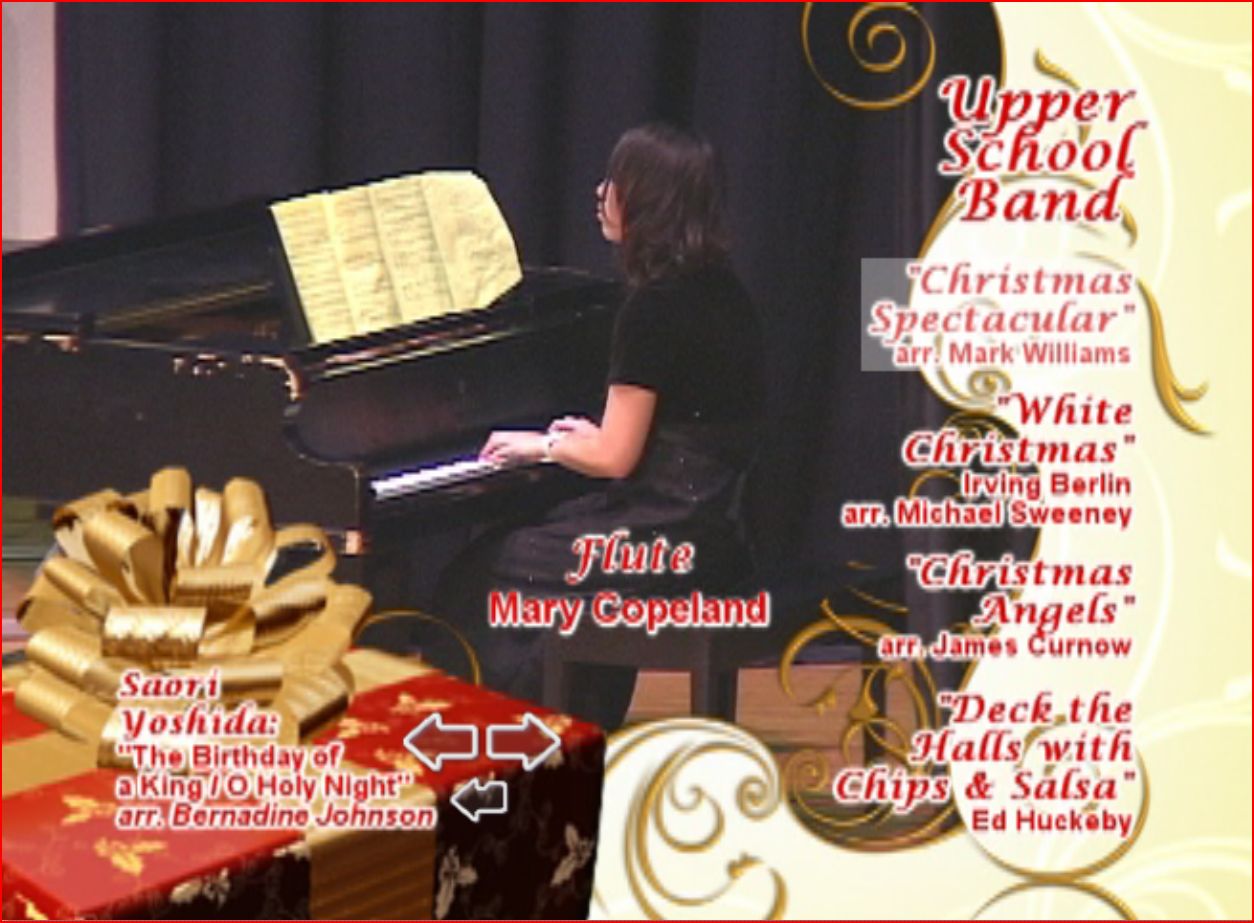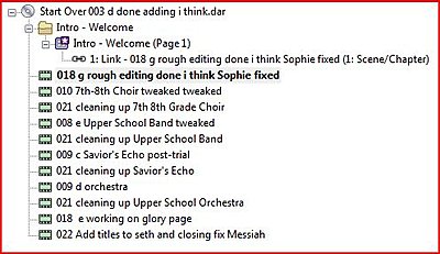 i guess i could do a screen shot... this compares the 2 structures i tried; whew! and screen shots of the soloists performances seconding as menus The actual class performances will play between the soloists, if not specifically selected by the user ahead of time. I guess one of my goals was to include the soloists in standard sequential play, while also spotlighting them in menus. I wanted to spotlight them without potentially isolating them from normal viewing. I also think it spices up the "menu." |