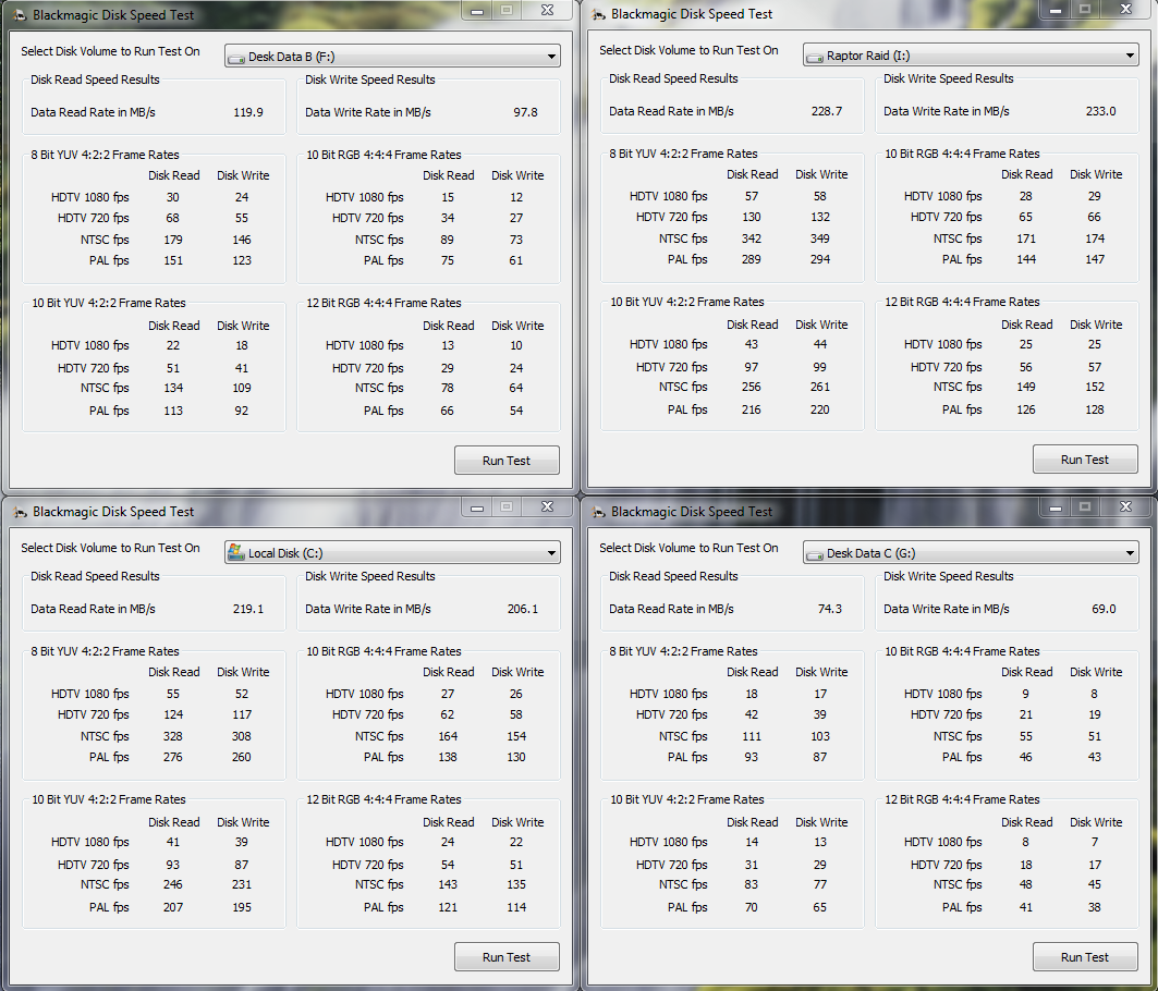 Drive C is a Falcon 2 SSD 124gb Desk Data B (F:) is a Seagate Barracuda 1 TB Raptor Raid is 2x WD Raptors in Raid 0 ( this is for my project media ) Desk Data C (G:) is a WD ECO Green 1 TB Some of the results are surprising, some aren't. I guess this is for anyone who is where I was at a few weeks ago, looking to get the best speed out of their editing. And yes, now I can multicam edit full HD with fast cutting and crossfades, and so far, not one hang or crash. |