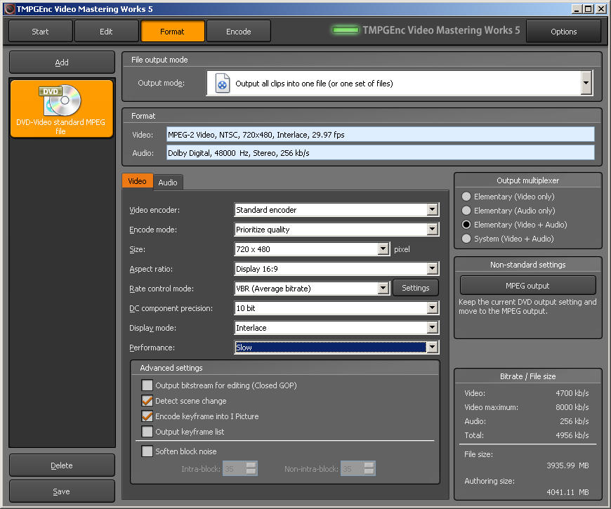 TMPGenc will set field order correctly for NTSC so do not touch. I normally choose separate video and audio files as most authoring programs prefer this form. 2 Hour program should have an average bit rate around 4000. These instruction are for TMPGenc 4Xpress but they are much the same for T5 other than the motion search is now under the advanced settings or can be set as computer performance "slow". Ron Evans |