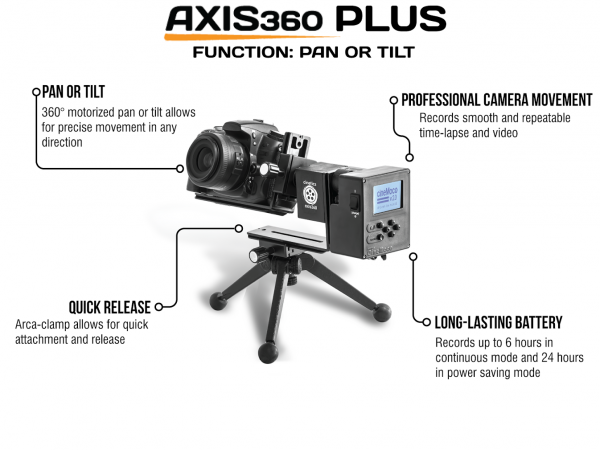 The Axis360 Pro includes all the components of the Plus kit as well as a slider rail for smooth, automated horizontal and vertical camera moves. Two and three axis motion control kits are also available for multi-dimensional moves.